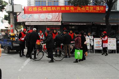 2月10日,石桥头镇禁毒办联合派出所、司法所、镇妇联等部门,在振兴路口组织开展以“平安回家路,无毒最幸福”为主题的禁毒“流动课堂”活动。当天正逢石桥头镇集市日,大街上人头攒动。20多名志愿者们拉起宣传横幅,竖起禁毒展示牌,吸引了不少过往群众驻足。志愿者们边发放《禁毒“流动课堂”活动读本》,边向群众介绍此次活动的内容,并用现场展示的毒品高仿样品教群众们认识其形态及危害“现在生活条件好了,毒品也越来越多,就算是看到了毒品也不认识,今天能够这么近距离看到高仿毒品样品,下次看到类似的东西也会多个心眼。”蒋师傅指着“毒品高仿样品”说道。据悉,石桥头镇每年都会不定时组织此类禁毒宣传活动,向群众发放禁毒宣传资料、展示样品、讲解禁毒知识,增强群众识毒、防毒、拒毒能力,营造平安和谐石桥。