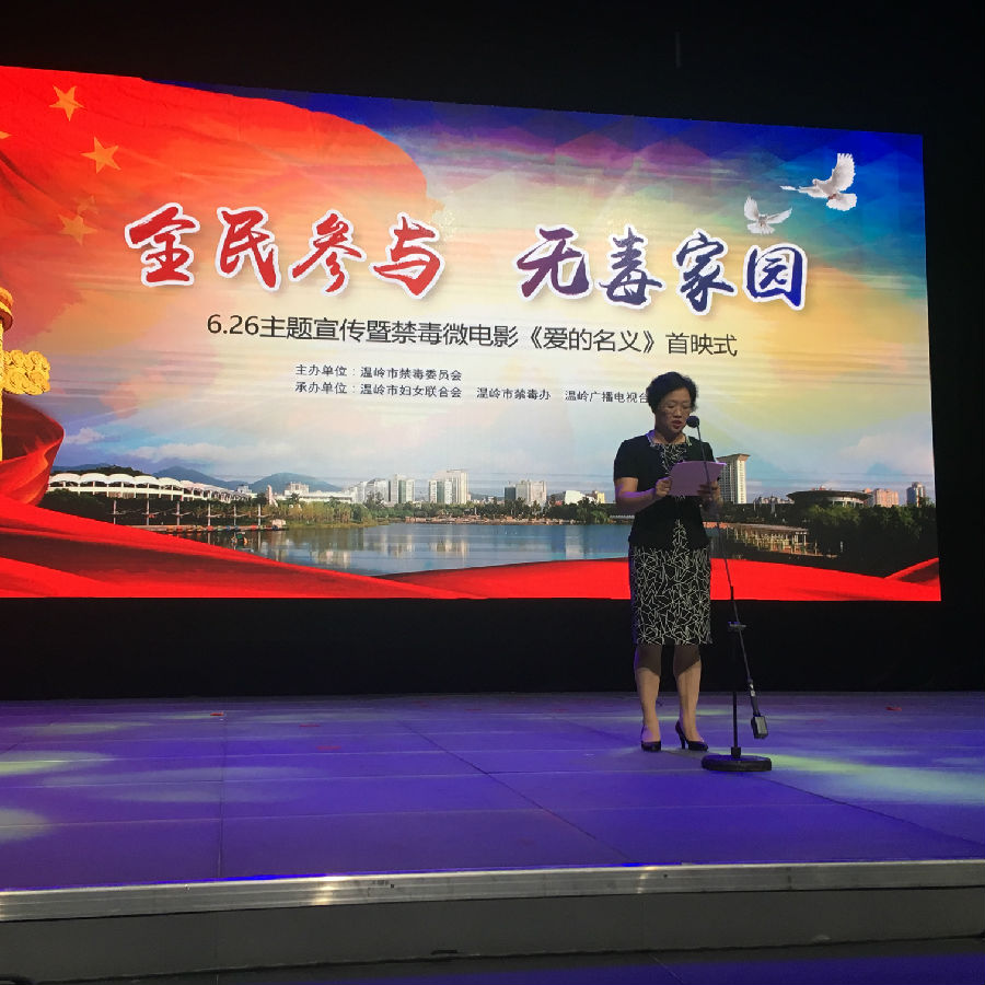 在国际禁毒日来临之际,6月22日下午,市妇联联合禁毒办在温岭广电总局演播大厅举行“全民参与 无毒家园” 6.26主题宣传暨禁毒微电影《爱的名义》首映式活动。市委常委、常务副市长、市禁毒委主任朱明连,市人大常委会副主任潘立平,市政协副主席叶旭艳参加了此次活动。参加活动的还有市禁毒委37个成员单位的分管领导、各镇(街道)妇联主席、分管禁毒的同志、部分村居(社区)妇联主席和禁毒娘子军代表,共约300余人。
