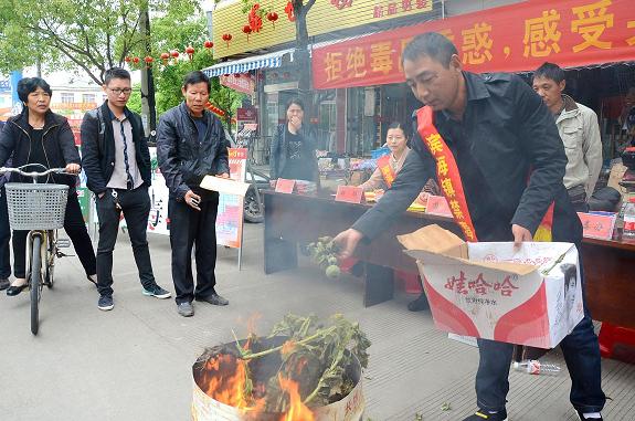 “全株粉绿色,花开单枝头……原来这就是罂粟花呀。”5月6日,在温岭市滨海镇东楼街,100多株罂粟在熊熊烈火中被焚烧,围观者拍手叫好。 当天,滨海镇禁毒办、妇联、团委、公安、消防等单位的有关人员走上街头,现场集中焚烧铲除的罂粟花,以提高村民对种植罂粟花违法的认识。在此同时,还利用横幅、展板及向村民发放禁毒宣传资料,讲解毒品的种类和危害,使禁毒宣传深入农村。